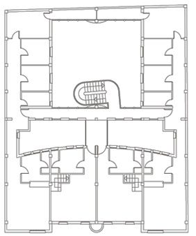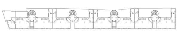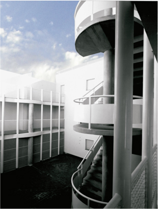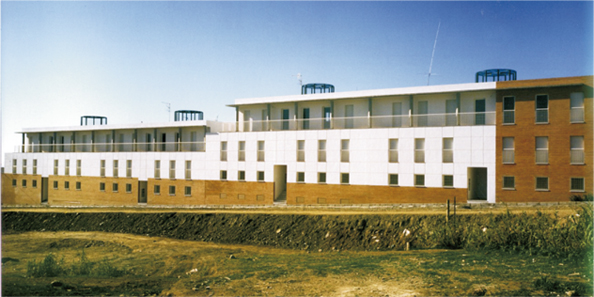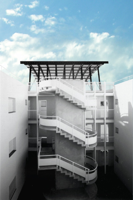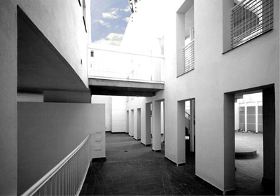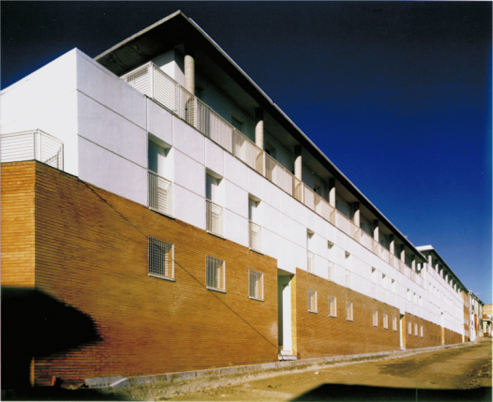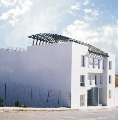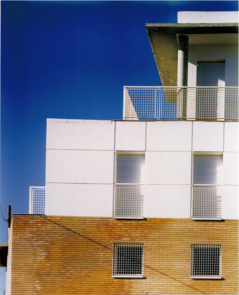La edificación se construye en torno a una seriación de volúmenes crujías y patios. En la construcción de la manzana A establecemos la permeabilidad espacial desde la calle hasta el fondo del patio, condición esta favorecida por el suave clima del lugar. El acceso a la vivienda es a través del patio en torno a una escalera singularizada en el mismo y una galería abierta. Sobre la cubierta se dispone una malla, como elemento de arquitectura comunicativa, que dibuja un cerro, uno más de los que contonean la ciudad y desde donde se observa el mar. La manzana B, al ser de poco fondo, se opta por aprovecharlo y construir una larga fachada que resuelva el diálogo con el entorno que la conforma, su pendiente y fundamentalmente la esquina urbana. Como en el caso de la manzana A todos los espacios son exteriores. La manzana C tiene una tipología similar variando soluciones de fachada por no hacer esquina y no existir aun edificios construidos en sus medianeras.