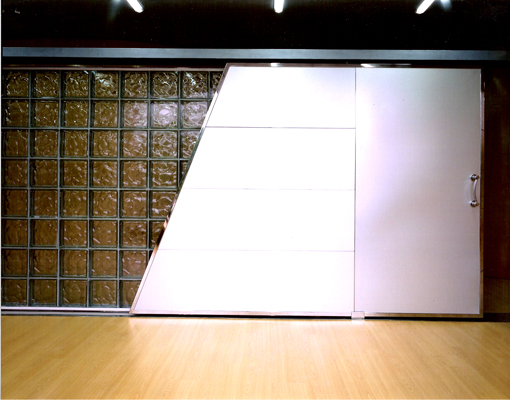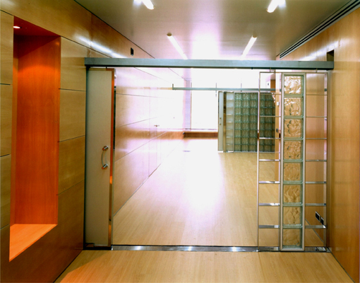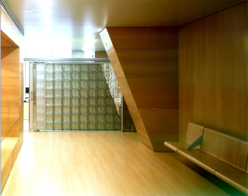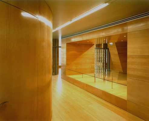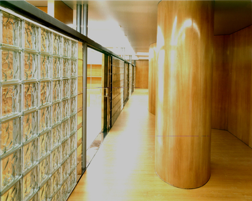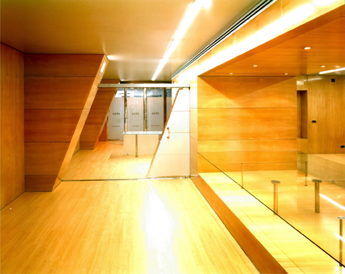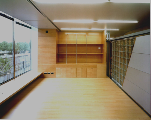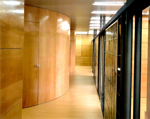 Dos gruesos muebles de madera separan los espacios de uso singular como los del gerente, sala de usos múltiples y oficina de administración. Dentro de su grosor se configuran lugares tales como un archivo y un ámbito para la exposición de maquetas.